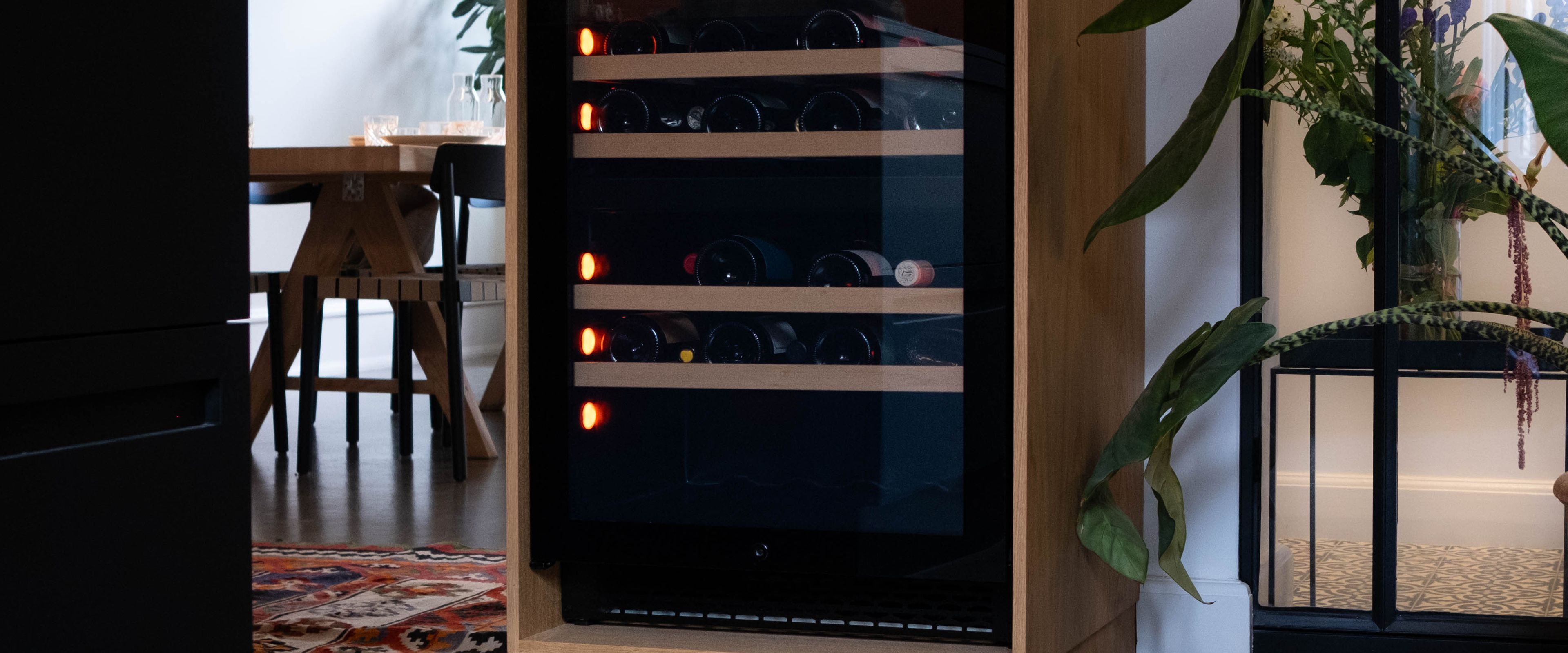 Una vetrina refrigerata per vino integrata si distingue inoltre dal fatto che l'armadio effettivo ha dimensioni inferiori rispetto al blocco cucina, poiché deve essere posizionato all'interno. Ad esempio, la larghezza della vetrina refrigerata per vino sarà generalmente di 55,5 cm (e sempre inferiore a 60 cm), mentre la porta sarà leggermente più larga e coprirà quindi il telaio del blocco cucina. Questo offre un risultato più completo e si adatta alla maggior parte delle cucine moderne